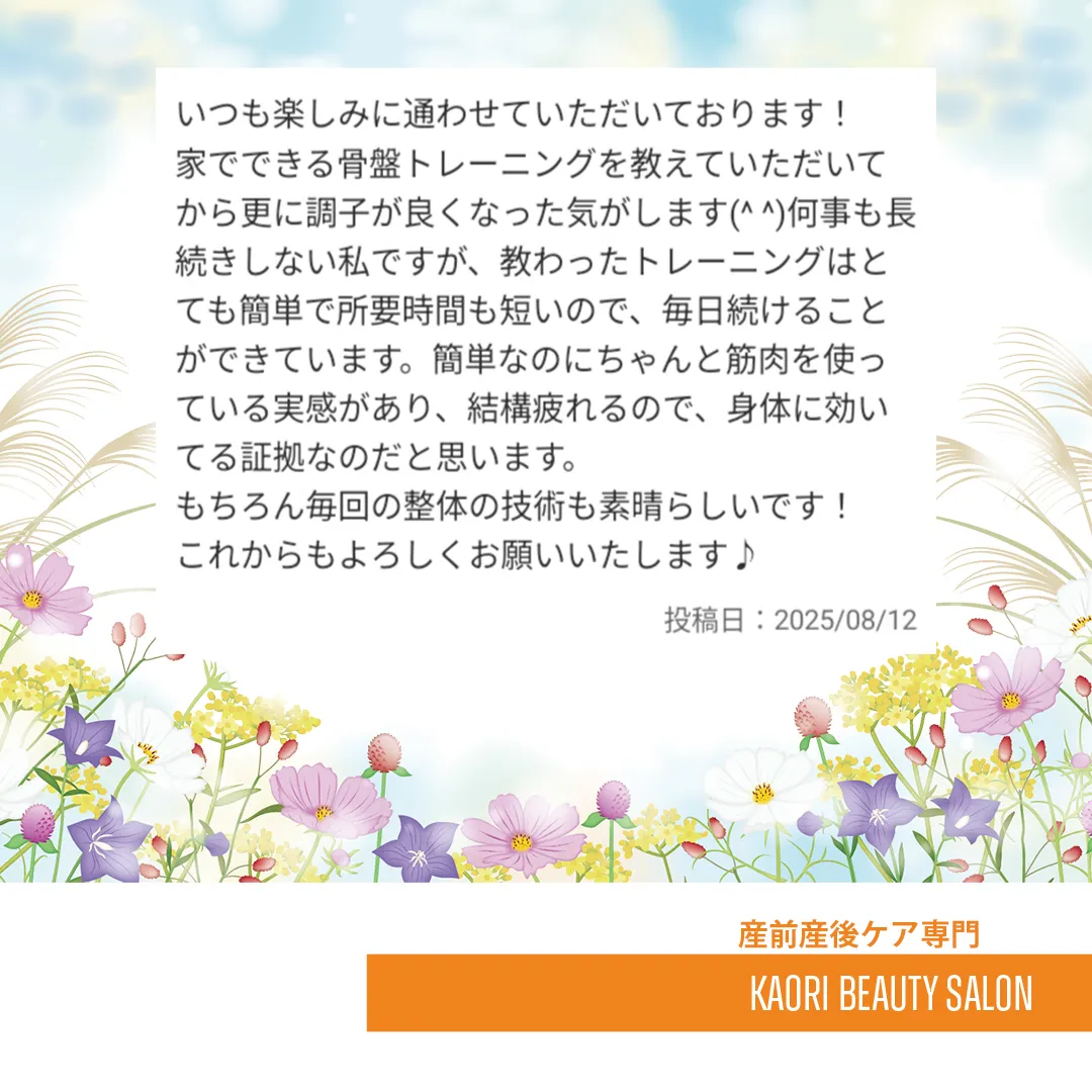 家でできる骨盤トレーニングを教えていただいてから更に調子が良くなった気がします(^ ^)