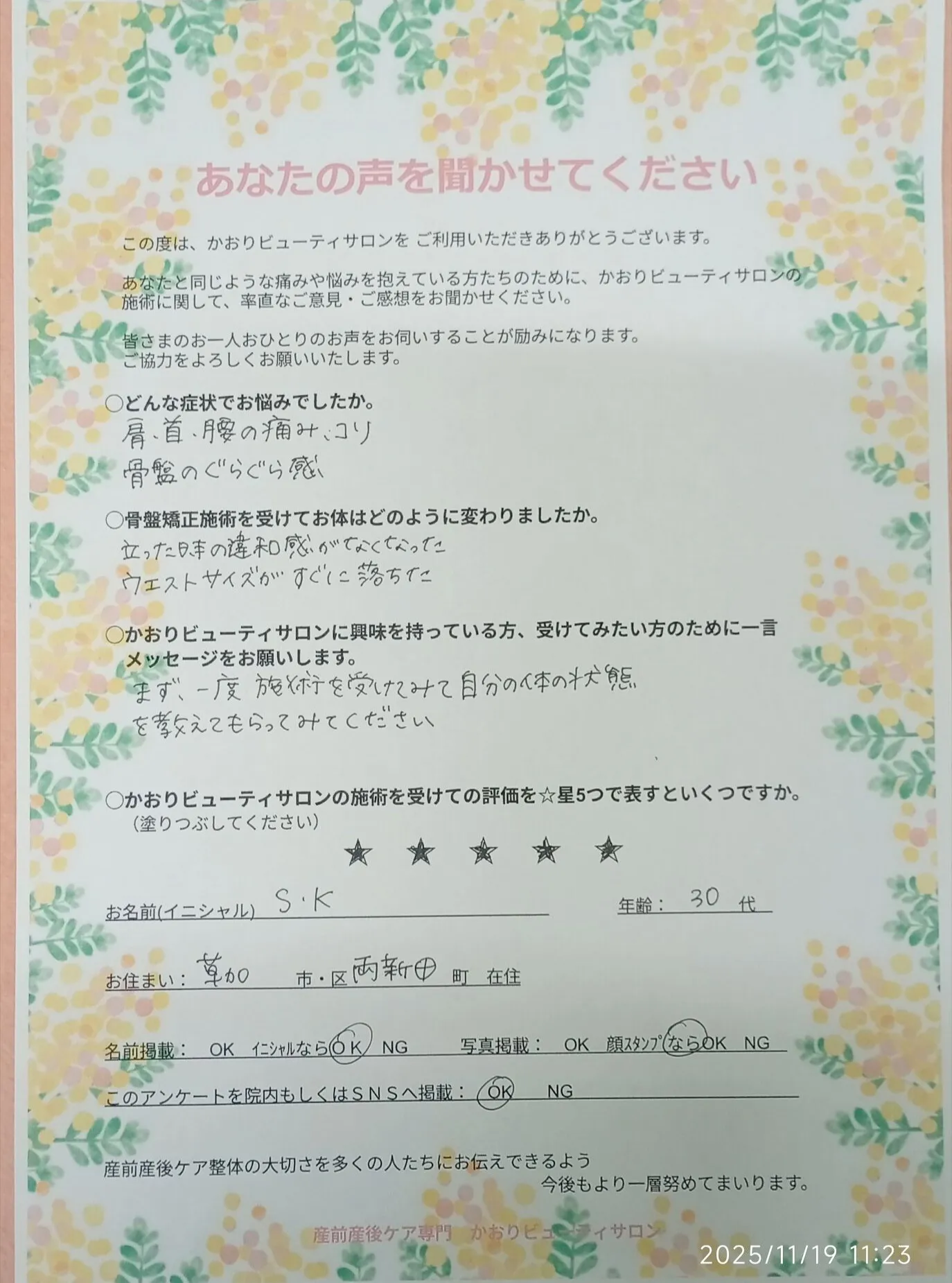 あなたと同じように痛みや悩みを抱えている方たちのために、KAORIの施術に関する事や院の雰囲気など、ご感想をお聞かせください。また、皆様お一人おひとりの喜びの声を聞くことがKAORIの励みになります。