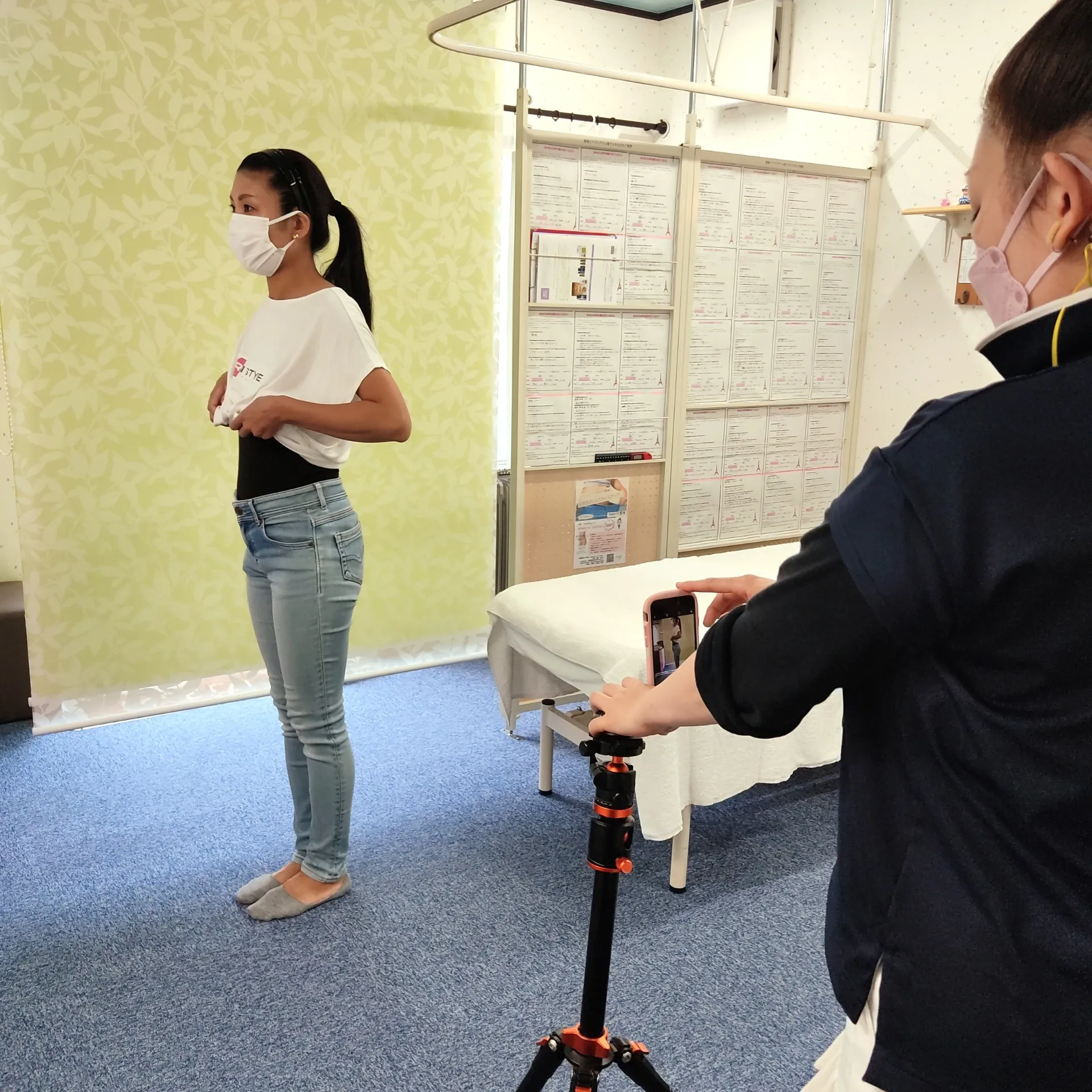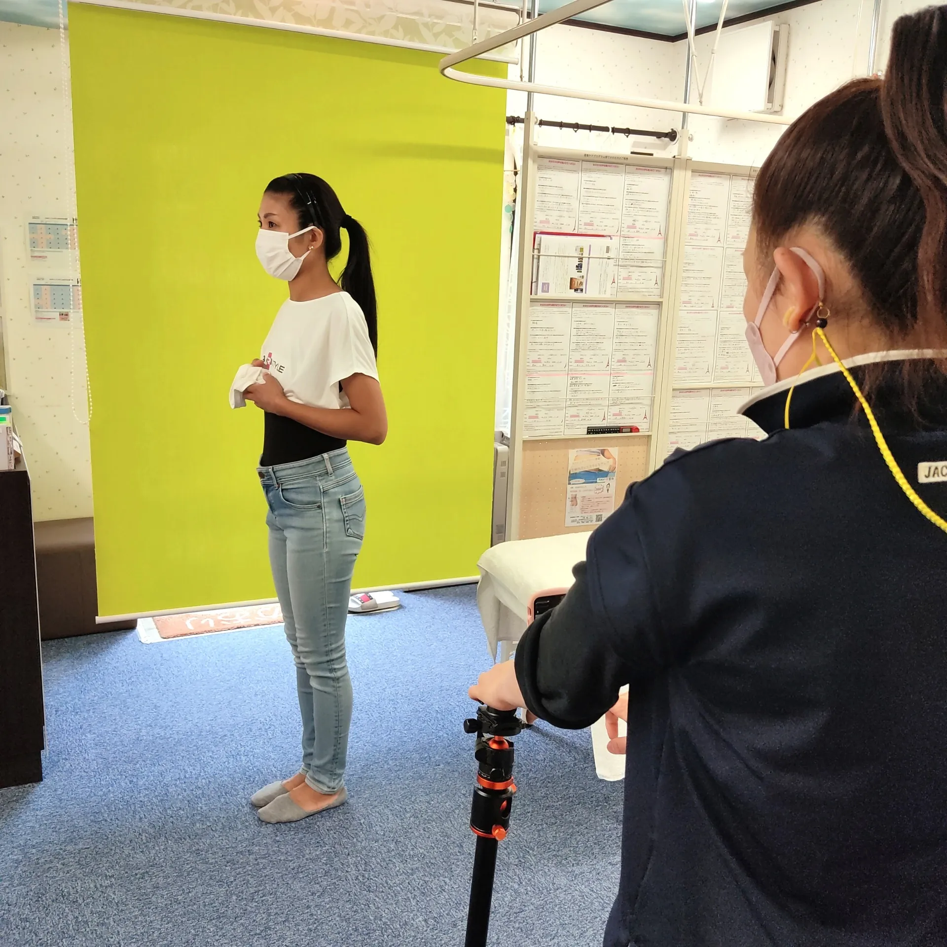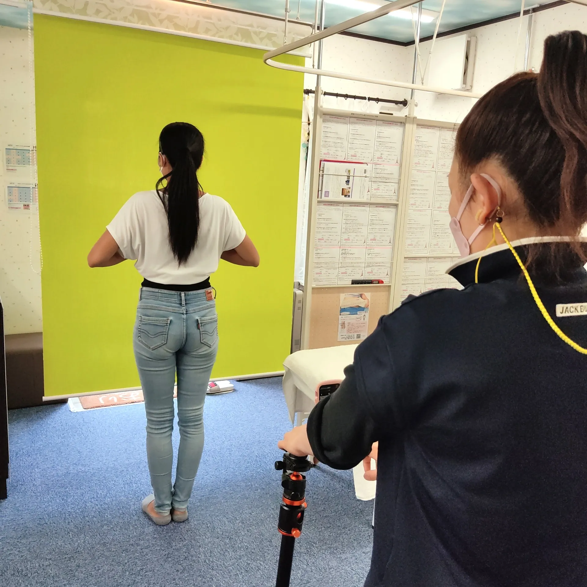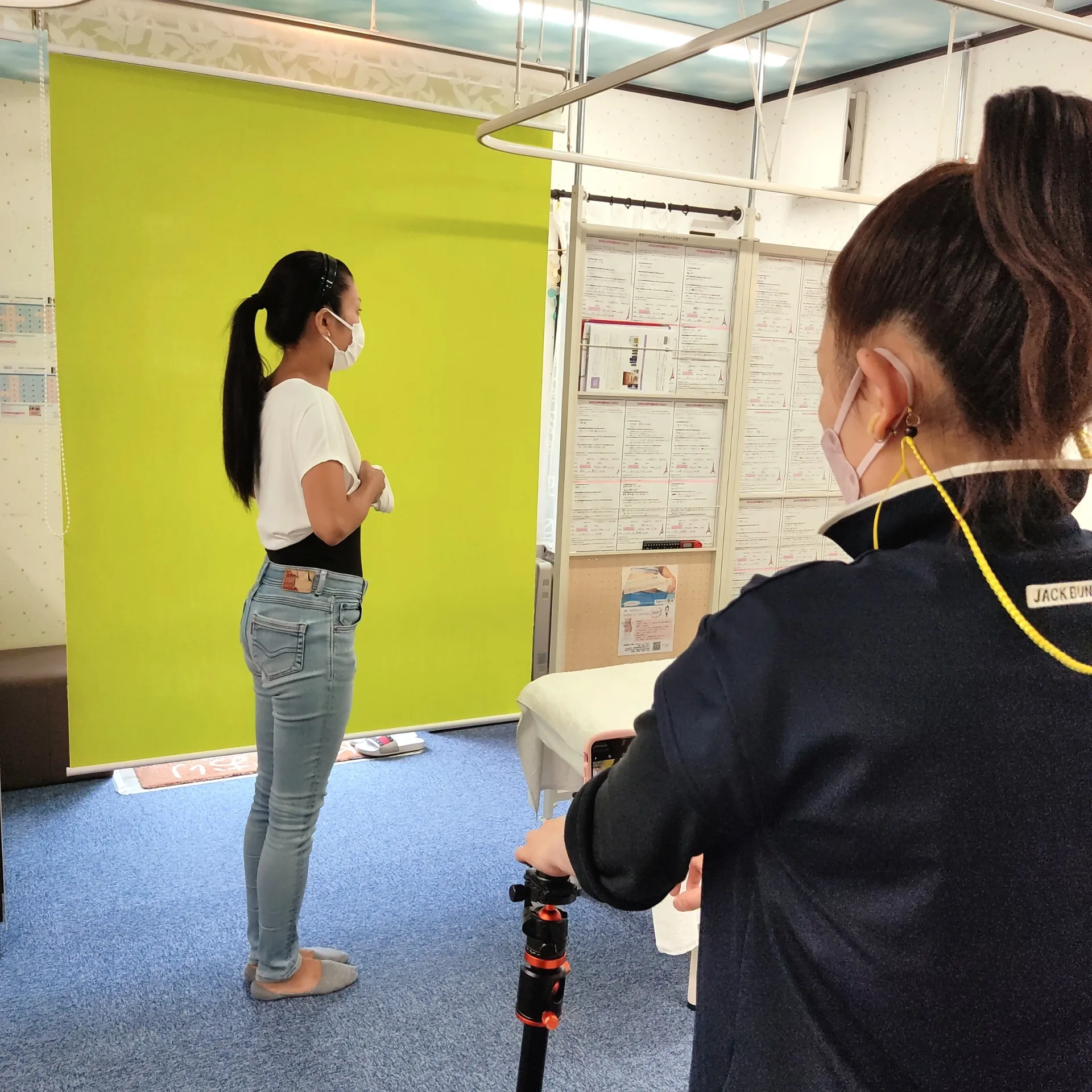 施術後写真撮影 前後左右 グリーンバック+白いカーテン