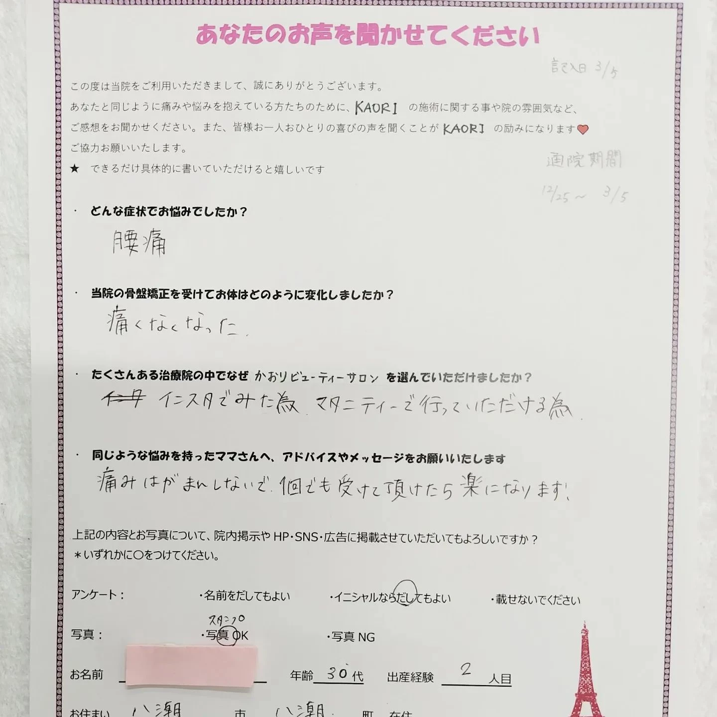 あなたと同じように痛みや悩みを抱えている方たちのために、KAORIの施術に関する事や院の雰囲気など、ご感想をお聞かせください。また、皆様お一人おひとりの喜びの声を聞くことがKAORIの励みになります