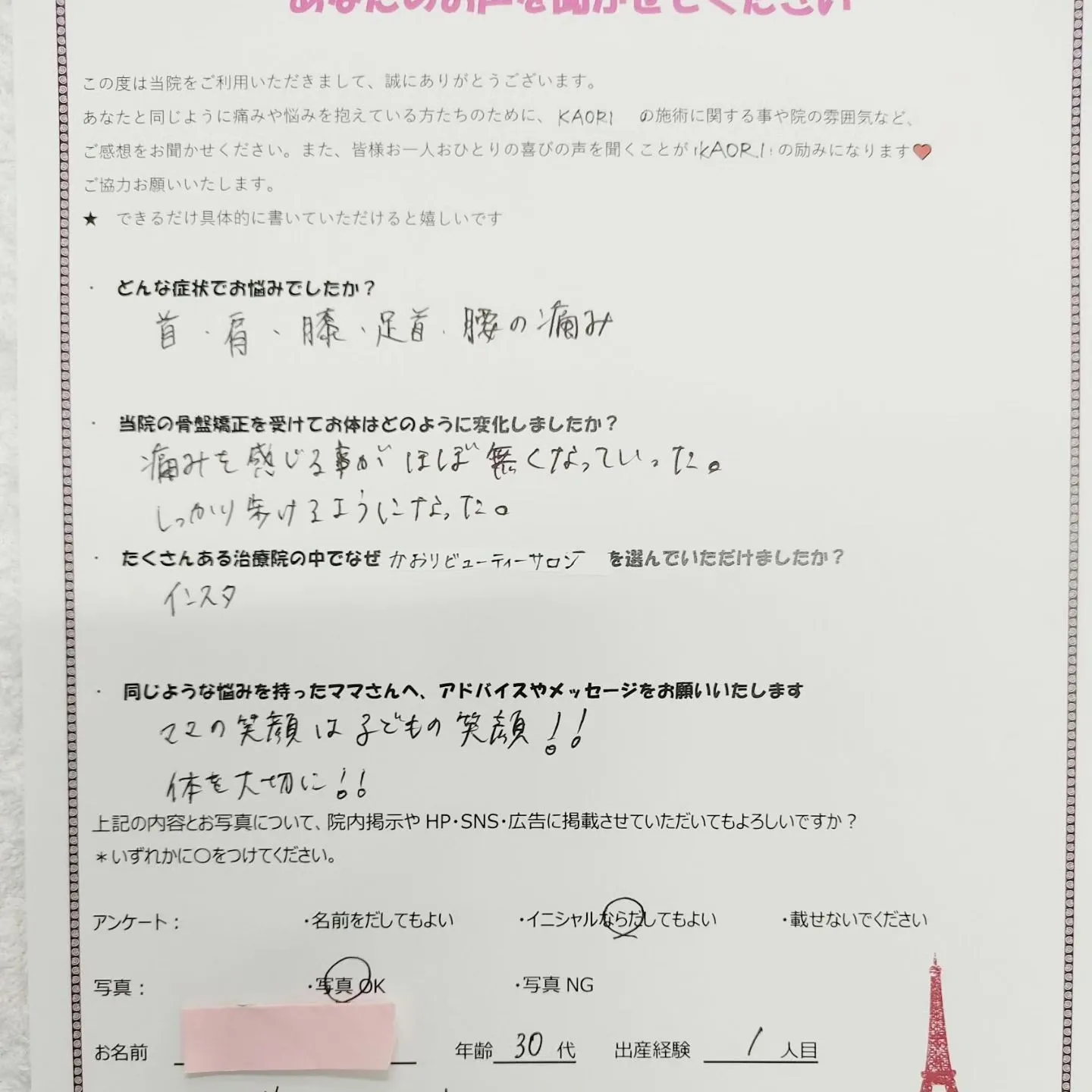 あなたと同じように痛みや悩みを抱えている方たちのために、KAORIの施術に関する事や院の雰囲気など、ご感想をお聞かせください。また、皆様お一人おひとりの喜びの声を聞くことがKAORIの励みになります
