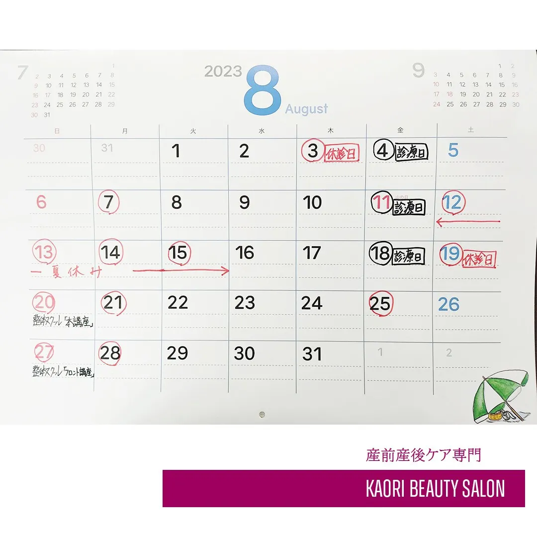 【8月診療カレンダー 産前産後ケア専門 かおりビューティサロン 草加市】