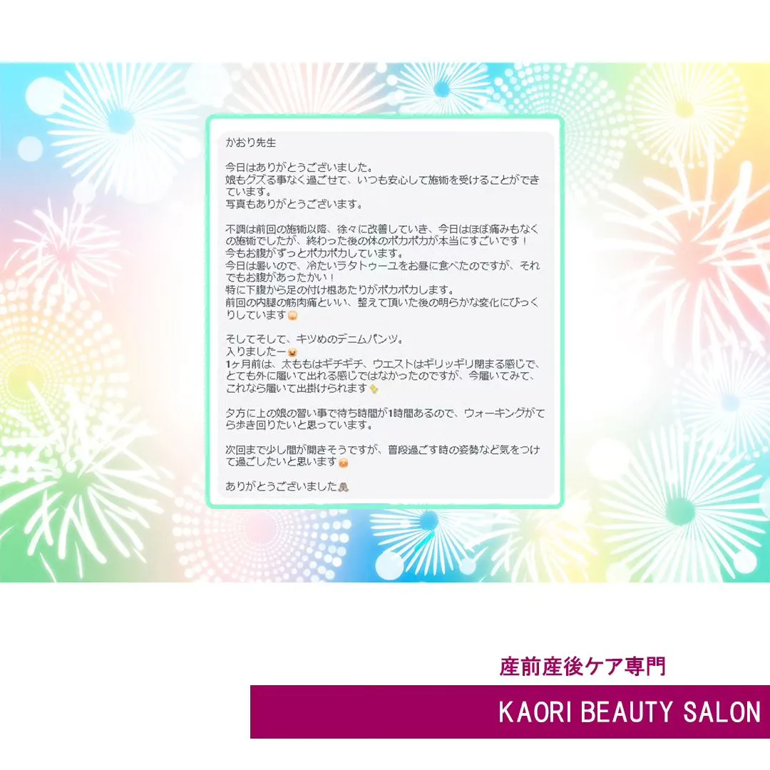【施術後に、うれしいメッセージをいただきました! 産前産後ケア専門 かおりビューティサロン 草加市】