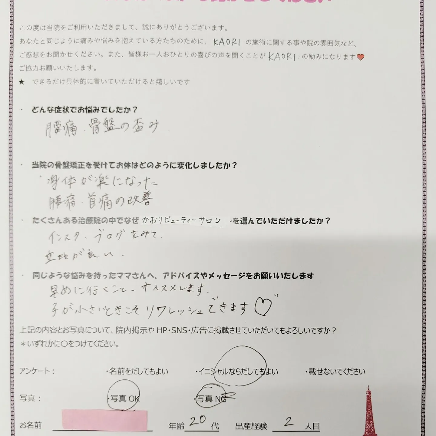 あなたと同じように痛みや悩みを抱えている方たちのために、KAORIの施術に関する事や院の雰囲気など、ご感想をお聞かせください。また、皆様お一人おひとりの喜びの声を聞くことがKAORIの励みになります