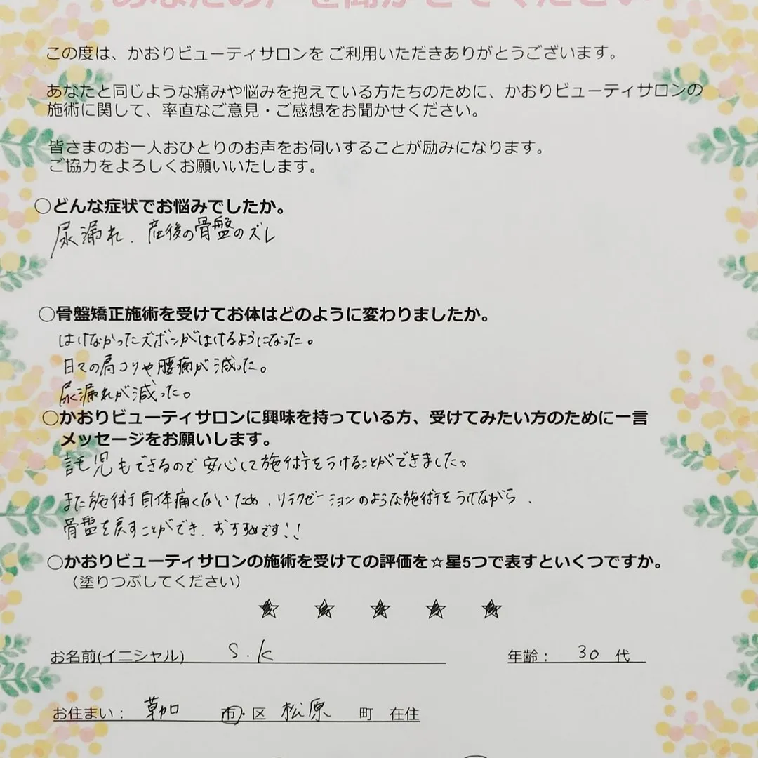 あなたと同じように痛みや悩みを抱えている方たちのために、KAORIの施術に関する事や院の雰囲気など、ご感想をお聞かせください。また、皆様お一人おひとりの喜びの声を聞くことがKAORIの励みになります。