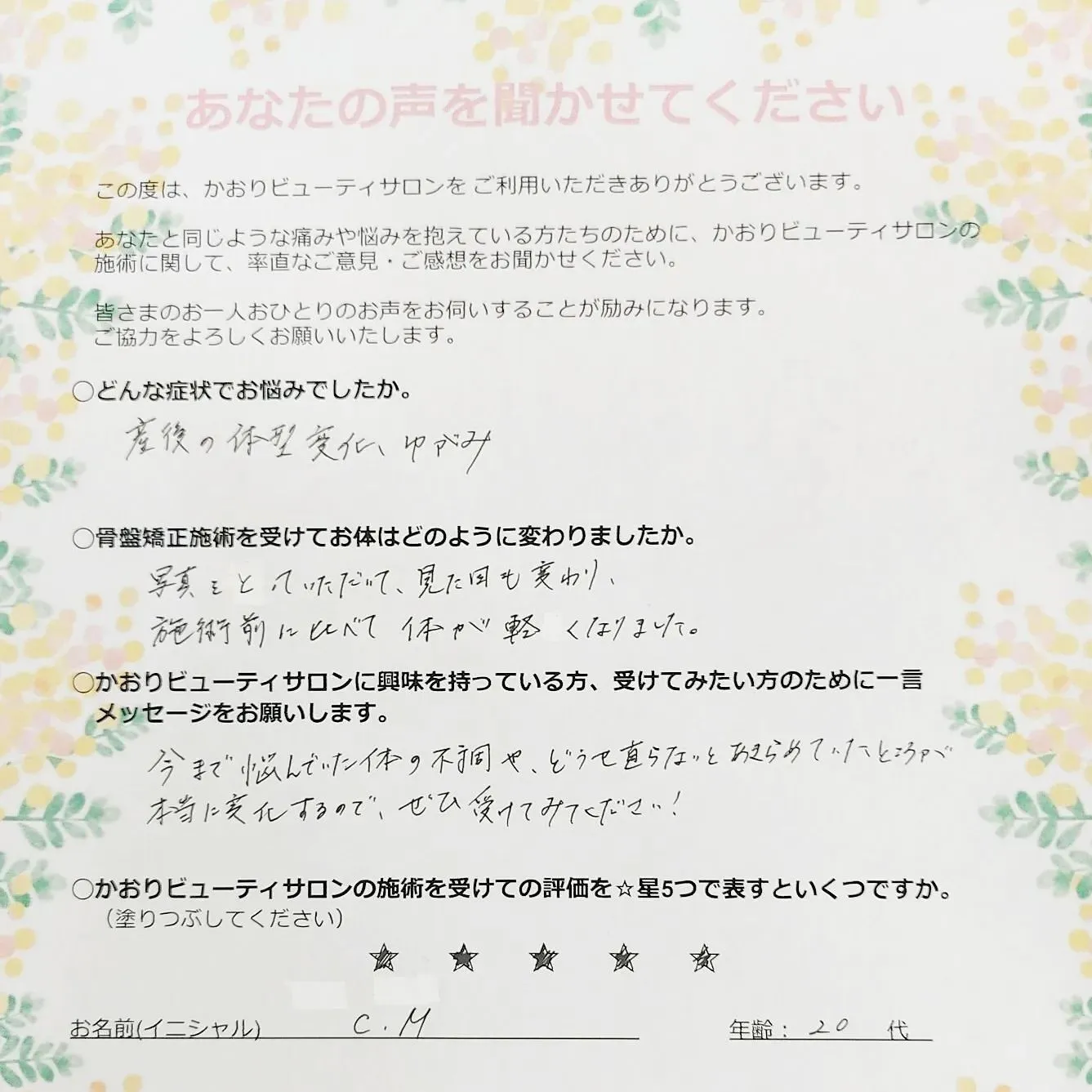 ☆かおりビューティサロンの施術を受けての評価を☆星5つで表すといくつですか。