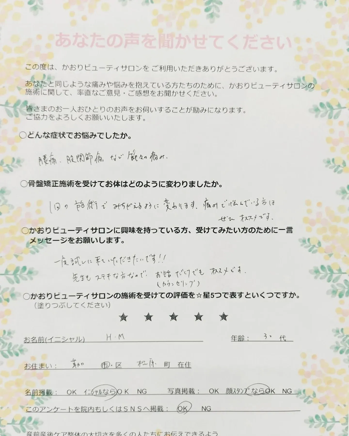 ☆かおりビューティサロンの施術を受けての評価を☆星5つで表すといくつですか。