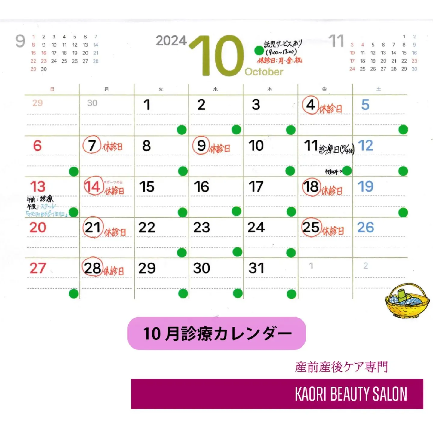 11日(金)→ 臨時診療日(10/9(水)休診分) 託児サービス付き(午後のみ)