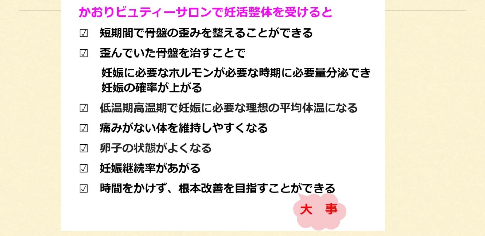 まとめますと、当院の妊活ケア整体は、ママのカラダを健康へと導き妊娠の確率を上げていきます。