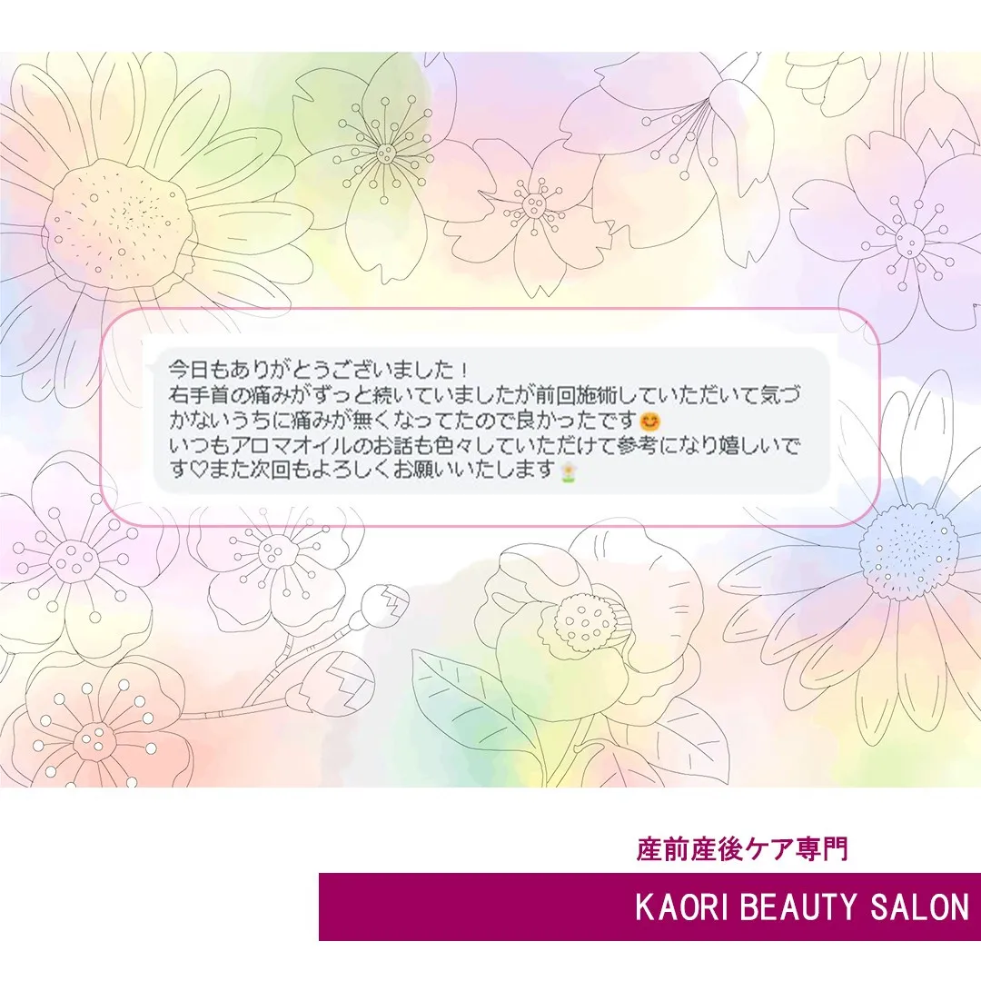 施術後に、うれしいメッセージをいただきました! 施術後に、うれしいメッセージをいただきました!----------------------------------------------------------------『今日もありがとうございました!右手首の痛みがずっと続いていましたが前回施術し…