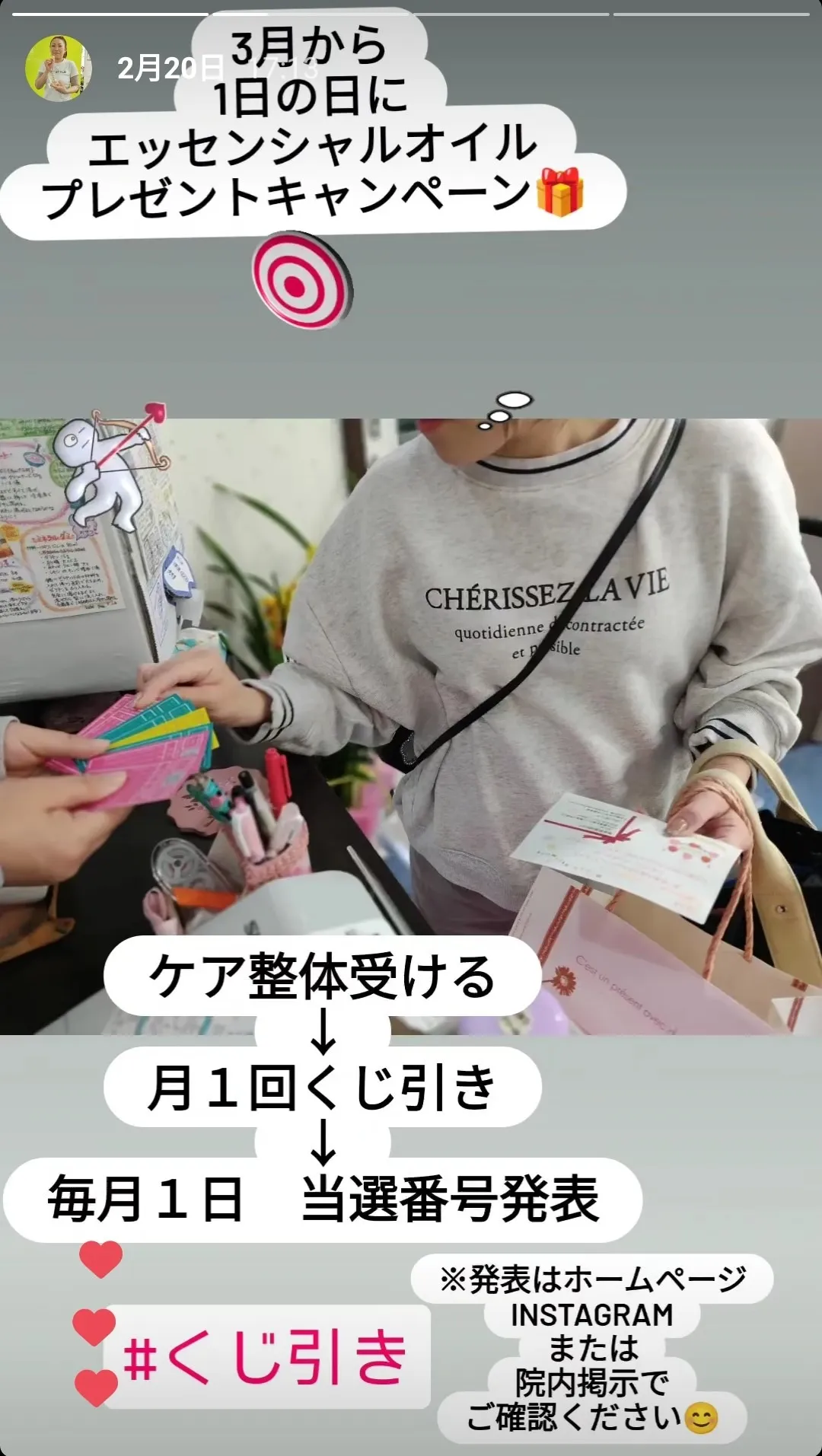 エッセンシャルオイルプレゼントキャンペーン 2024.2.203月から1日の日に「エッセンシャルオイルプレゼント」キャンペーンを始めます!!ケア整体を受ける↓↓↓月1回番号の書かれているおみくじカードを引く(なくさにように大事に保管してくださいね)…
