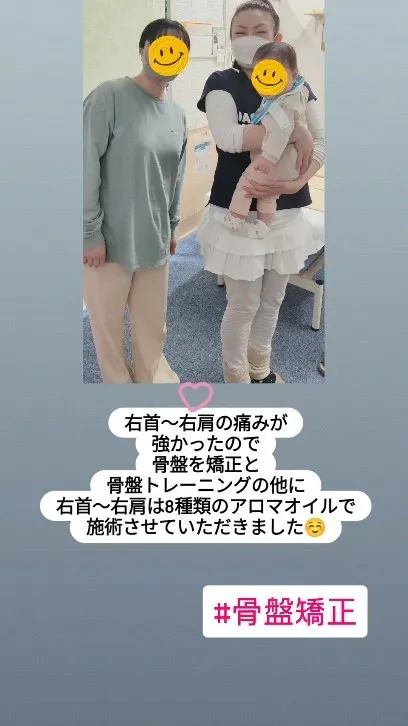 本日ご来院いただきまして、 本日ご来院いただきまして、右首〜右肩の痛みが強かったので・骨盤の矯正と・骨盤トレーニングの他に右首〜右肩は8種類のアロマオイルで施術させていただきました☺◯◯さまご来院いただきうれしいこといっ…
