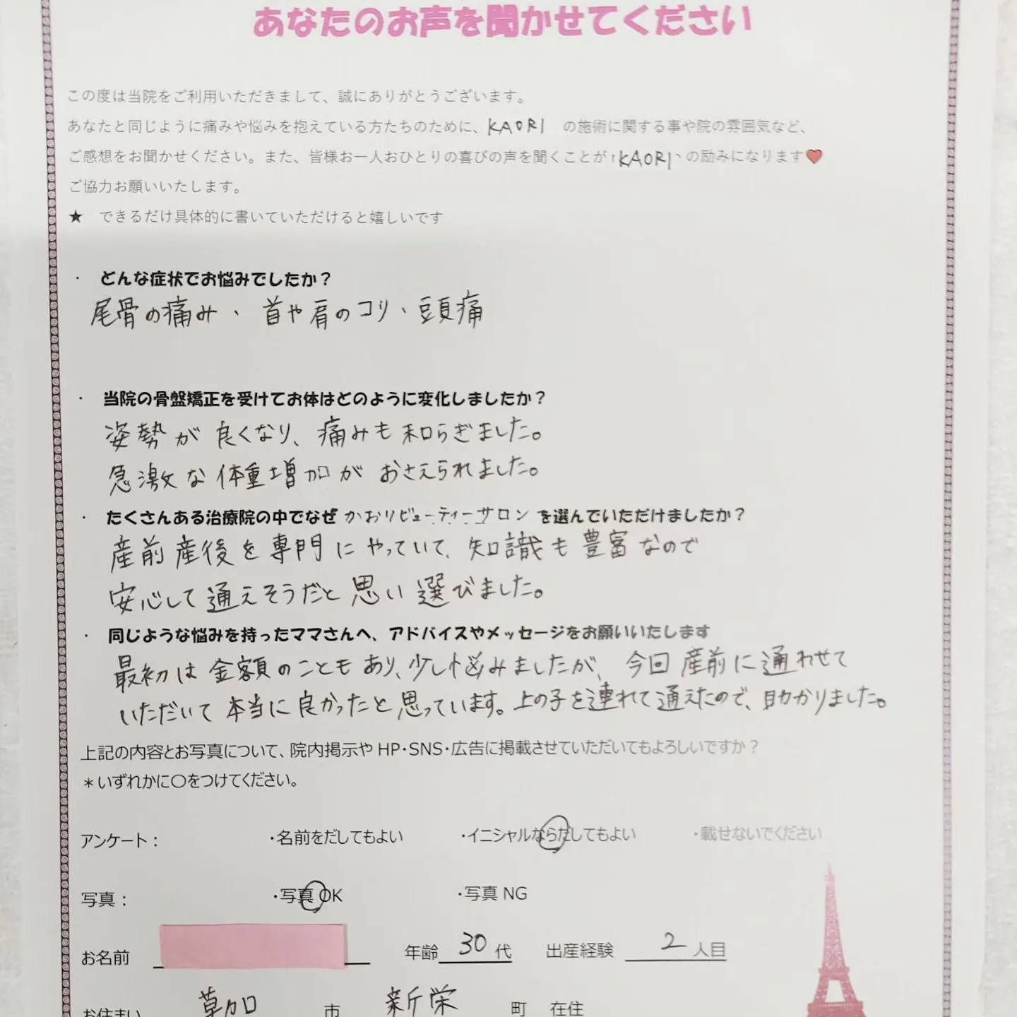 【産後はじめてのご来院いただき、無事ご出産したことなどお伺い... 【産後はじめてのご来院いただき、無事ご出産したことなどお伺いできました産前産後ケア専門かおりビューティサロン草加市】ライフステージ:産後今日の患者さま:マタニティケア&産後ケア整体12回コー…