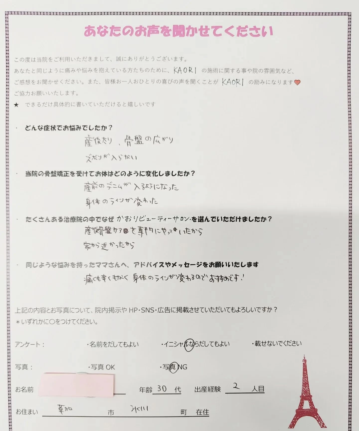 【産前ケア(妊活)をしてこれから妊娠をご希望している方の感想... 【産前ケア(妊活)をしてこれから妊娠をご希望している方の感想です産前産後ケア専門かおりビューティサロン草加市】今回、ご紹介させていただきます患者さまは産前ケア(妊活)をしてこれから、妊娠をご…