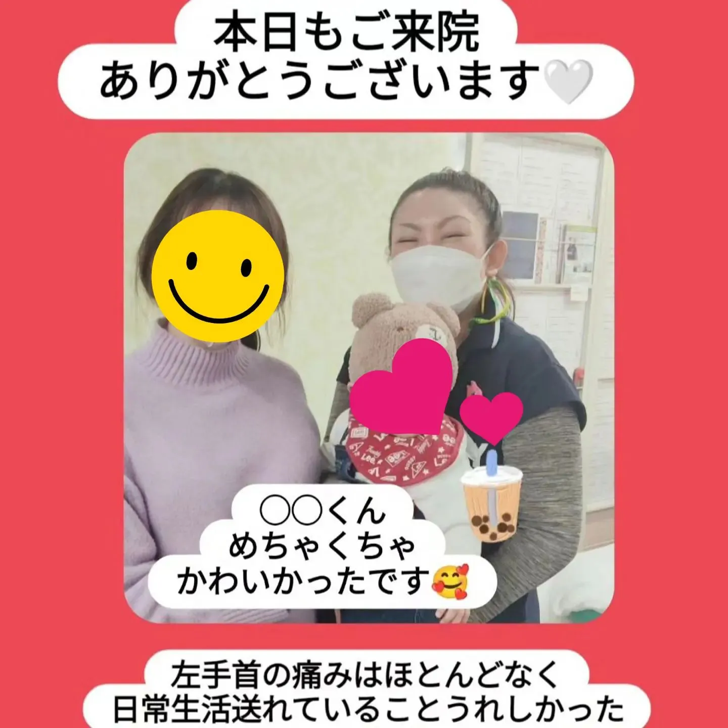 本日も産後ケア整体を施術させていただきました。前からあった腰痛気にならなくなったこと教えていただきました☺️✨骨盤も歪まなくなり骨盤ケアも順調です✨✨お子さまおふたりもお元気なことも教えていただ…