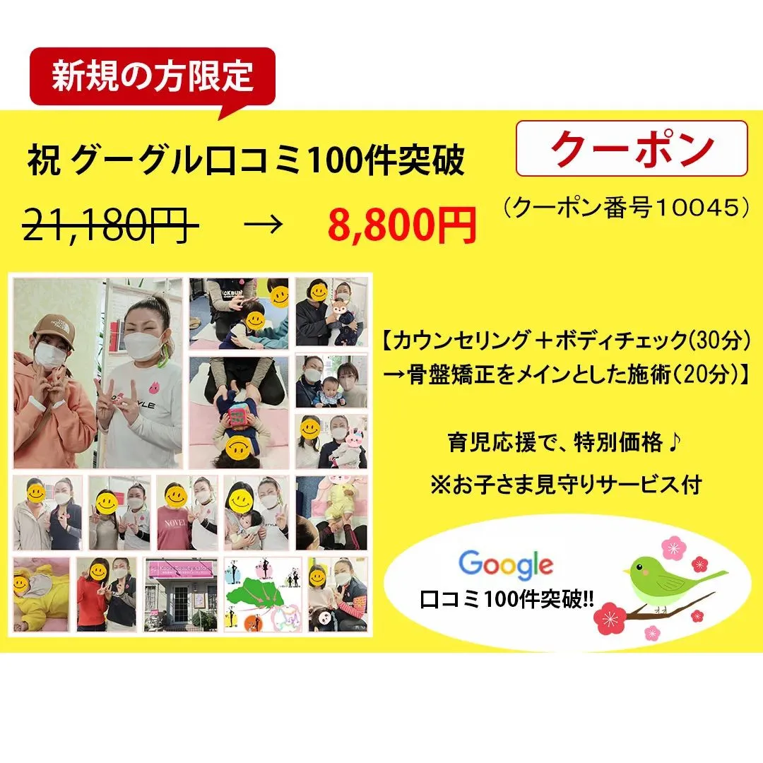 ━━━━━━━━━━━━━━━━ 祝グーグル口コミ100件突破 ━━━━━━━━━━━━━━━━ 3月限定このクーポンでの新規受付枠10組限定 ※人数制限あり 新規ご予約枠が埋まり次第終了 あなたもこのような産後のお悩みありません…