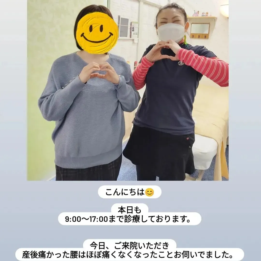 ご来院いただきありがとうございました! ご来院いただきありがとうございました!今日、ご来院いただき産後痛かった腰はほぼ痛くなくなったことお伺いできました。〇〇〇くんの成長も順調で前に進むようになったことや離乳食のことなどお話させ…