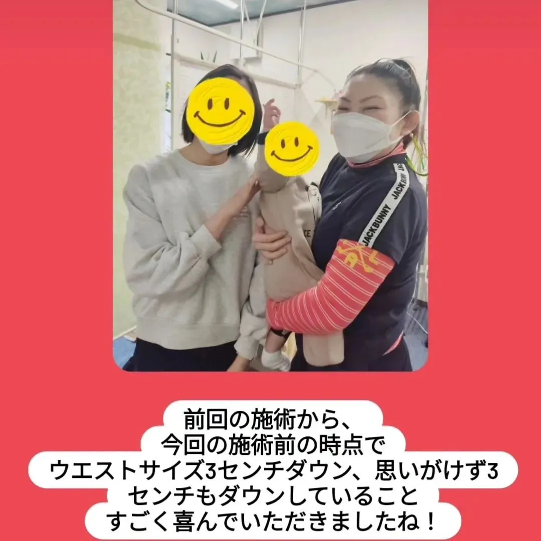 ご来院いただきありがとうございました! ご来院いただきありがとうございました!前回の施術から、今回の施術前の時点でウエストサイズ3センチダウン、思いがけず3センチもダウンしていることすごく喜んでいただきよかったです。順調にウエスト…